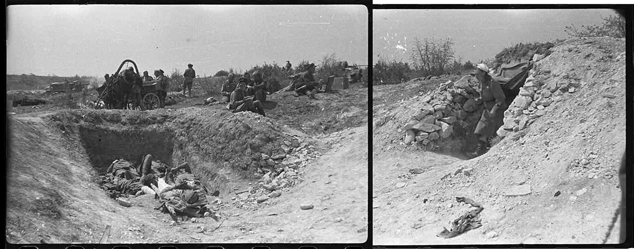 Панарама пункта медыцынскай дапамогі ў раёне Фядзюкіных вышынь. Злева — параненыя ў хованцы; справа — бліндаж санітарнай роты. 9 траўня 1944 года