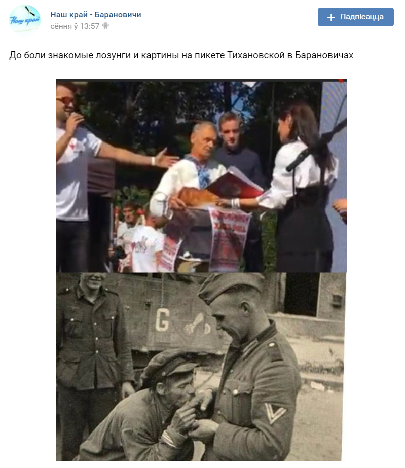Баранавіцкая раённая газета «Наш Край» адрэагавала арыгінальным чынам на гэта палітычнае мерапрыемства. У сацыяльных сетках газеты быў апублікаваны калаж, у якім Святлану Ціханоўскую і мясцовых жыхароў параўналі з акупантамі і тымі, хто перад імі рабалепствуе.