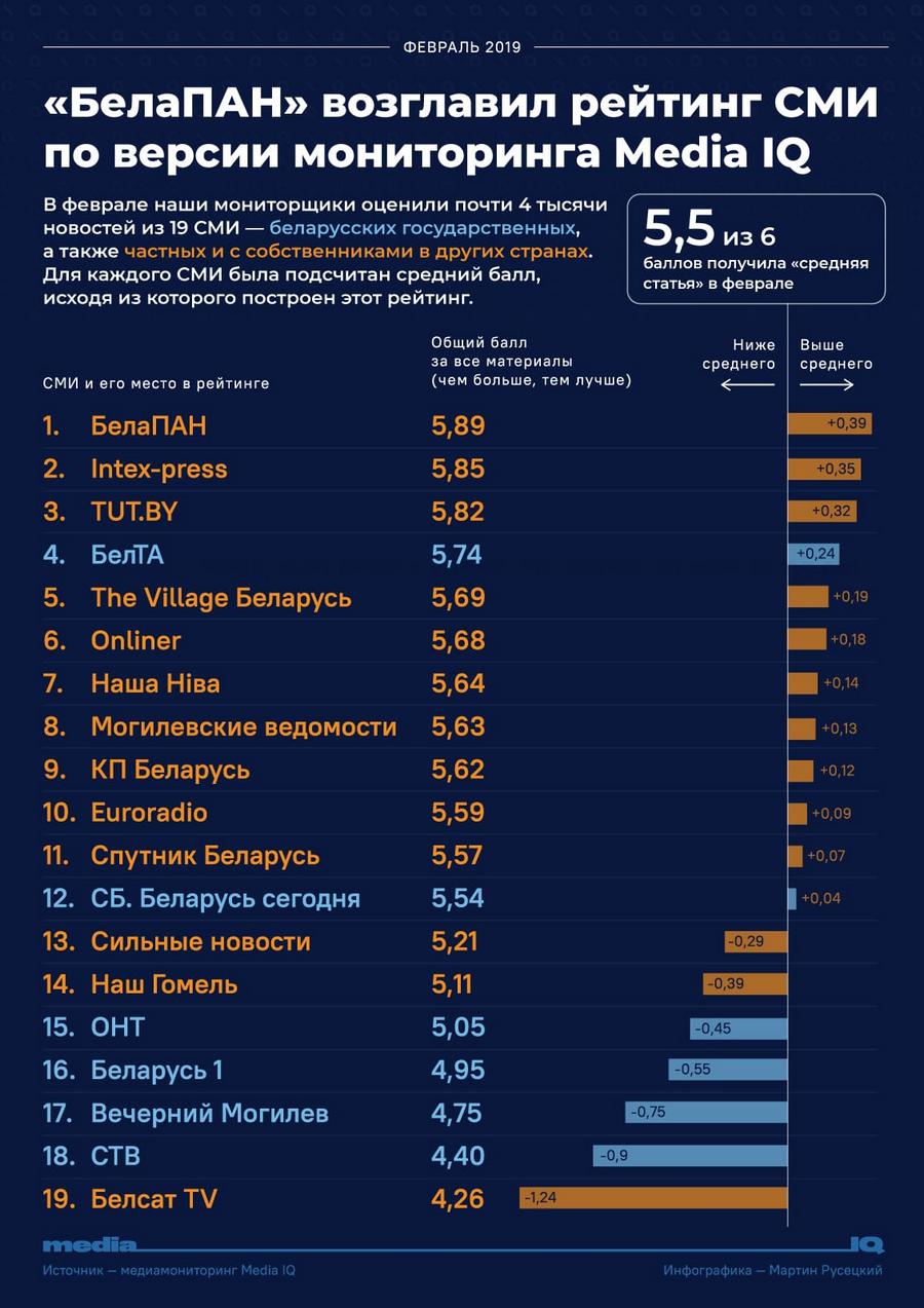 Наибольший средний балл (5,89) по соблюдению стандартов по итогам февраля получает независимое информационное агентство БелаПАН, наименьший (4,26) — вещающий из Польши телеканал «Белсат» (подразделение общественного Польского телевидения).