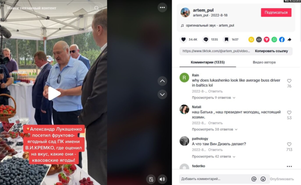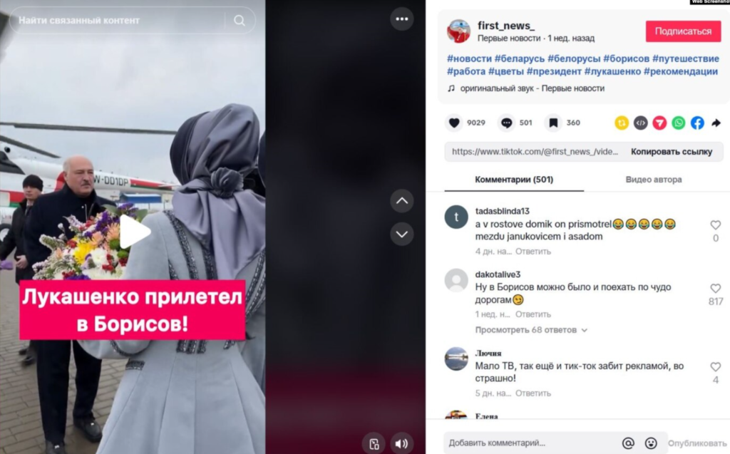 «У TikTok ня бачна, што ёсьць сур’ёзнае ўкладаньне грошай у рост акаўнтаў прапаганды. Там ёсьць шчырыя фанаты Лукашэнкі, замежная аўдыторыя, часткова ўкраінская аўдыторыя. На самых буйных каналах агульная колькасьць праглядаў будзе некалькі мільёнаў. Вірусяцца асобныя відэа», — кажа адна з экспэртак, якая пажадала захаваць ананімнасьць.