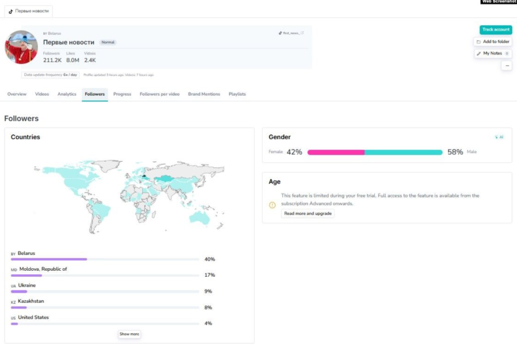 Сэрвісы для аналізу аўдыторыі TikTok адносна маладыя, для аналізу дадзеных яны могуць выкарыстоўваць розныя альгарытмы, таму вынікі могуць адрозьнівацца. Калі ж прааналізаваць падпісчыкаў каналу @first_news_ уручную, то шэраг акаўнтаў-падпісчыкаў выглядаюць «нежывымі»: маюць адзін ці некалькі запісаў, некаторыя зь іх на неўласьцівых для Беларусі мовах.