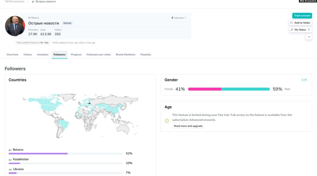 Іншыя сэрвісы аналізу падпісчыкаў даюць адрозныя зьвесткі, але таксама паказваюць вялікую небеларускую аўдыторыю. Падобную статыстыку, дзе менш за палову падпісчыкаў — зь Беларусі, дае аналіз і іншых акаўнтаў такога кшталту.