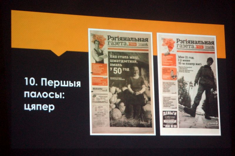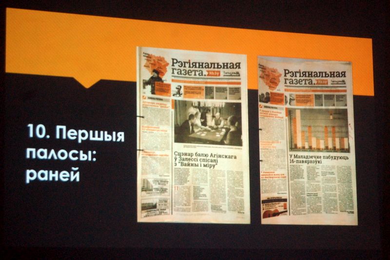 – Цяпер у нас ёсць сапраўды крэатыўныя арыгінальныя рашэнні ў вёрстцы, у падачы фотарэпартажаў. Напрыклад, мы перасталі баяцца ставіць у нумар фота на ўсю старонку. Мы распрацавалі вельмі добры варыянт першай паласы, дзе сёння вы нават не знойдзеце інфармацыі – толькі фота і анонсы галоўных матэрыялаў. Ад гэтага выйграла ўсё: і змест, і якасць, і ўвогуле наша каманда, – дадае журналістка “Рэгіянальнай” Настасся Роўда.