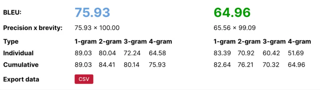 Мы параўналі якасць перакладу на беларускую з дапамогай алгарытма BLEU (bilingual evaluation understudy) ад ChatGPT і мадэлі Lingvanex. Ва ўсіх выпадках апошняя перамагла, хоць і з адносна невялікім адрывам.