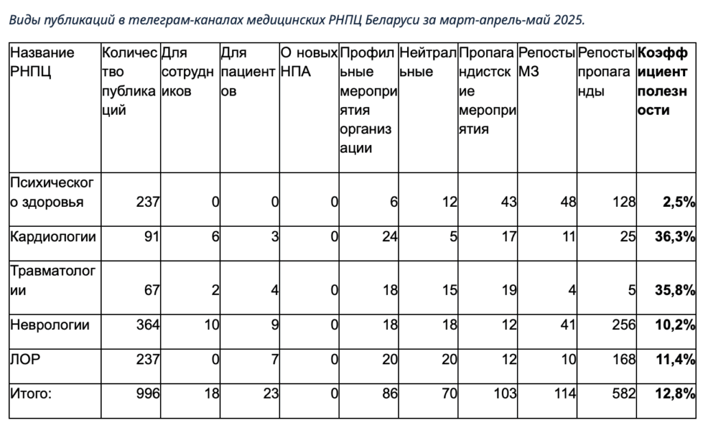 Чэмпіёнам гэтага «спісу па бескарыснасці інфармацыі» Уладзімір Пікірэня называе РНПЦ псіхічнага здароўя. Больш за 97% публікацый не ўяўляюць ніякай каштоўнасці для медыкаў ці пацыентаў. З іх каля паловы — гэта рэпосты розных прапагандысцкіх каналаў. Часцей за ўсё цытуюцца каналы Мінгарвыканкама, прафсаюзаў і крыніцы кшталту «Пул першага».