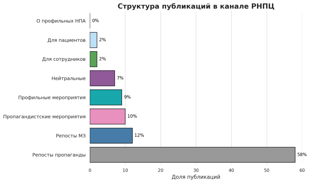 Рэспубліканскія навукова-практычныя цэнтры (РНПЦ) — гэта арганізацыі аховы здароўя, якія лечаць найболш складаныя выпадкі, вядуць навуковыя даследаванні і займаюцца асветай. Усе РНПЦ маюць свае тэлеграм-каналы. Але якасць матэрыялаў у іх, на думку эксперта, настолькі нізкая, што, каб не ведаць пра статус афіцыйнай крыніцы інфармацыі, можна было б закінуць канал у спам.