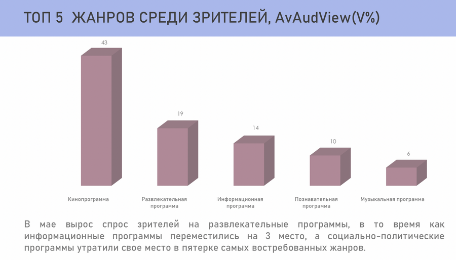 Са справаздачы MediaMeter таксама бачна, што беларускі глядач аддае перавагу кінапраграмам і забаўляльнаму кантэнту, але калі гаворка ідзе пра рэйтынг канкрэтных праграм, то тут наперад вырываюцца інфармацыйныя.