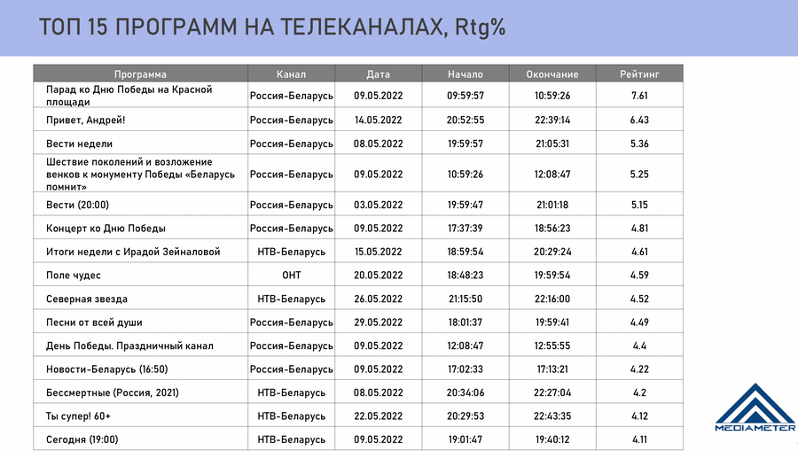 Кампанія «МедыяВымяральнік» падзялілася штомесячнай справаздачай пра тэлеглядзенне беларусаў. У топ-15 праграм — шэсць інфамацыйныя, і толькі адна з іх — беларуская. І тое гэта «Навіны Беларусь», якія выйшлі ў эфір на свята 9 мая.
