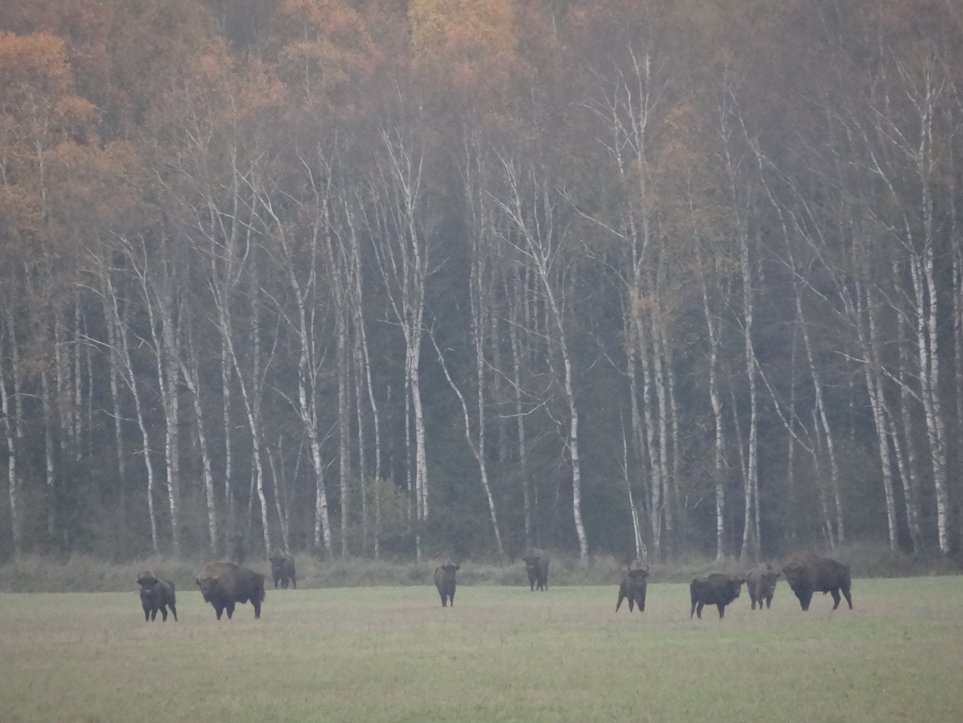 А гасцям, натуральна, падавай зуброў! Яны тут да месца, яны чаканыя. І нам іх паказалі. Дакладней, волаты нам папазіравалі крыху, здалёк, на вольным выпасе ў полі, зялёным ад руні. Узыйшла сеянка, падкормка гігантам. Іх ужо больш за 460, і асушаныя пушчанскія абсягі даюць замала травы.