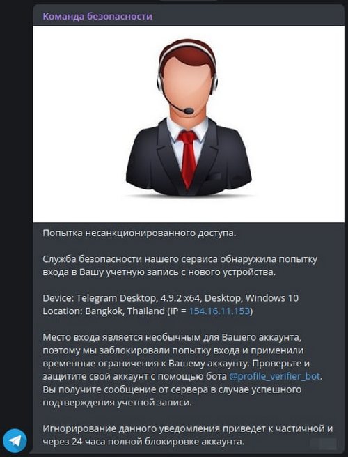 Пользователи Telegram получали сообщение примерно следующего содержания: «Попытка несанкционированного доступа. Служба безопасности нашего сервиса обнаружила попытку входа в Вашу учетную запись с нового устройства». Далее шло описание версии Telegram, устройства и локации, откуда якобы была попытка незаконного входа.