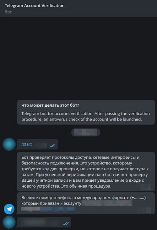 «Бот проверяет протоколы доступа, сетевые интерфейсы и безопасность подключения. Это устройство, которому требуется код для проверки, но которое не получает доступ к чатам. При успешной верификации наш бот начнет проверку Вашей учетной записи и Вам придет уведомление о входе с нового устройства. Это обычная процедура».