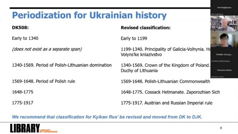 — На ілюстрацыі бачна, што першы бібліятэкар, які сфармуляваў частку, дзе Украіна фігуруе, зрабіў гэта ў 1916 годзе. Украіна там называлася Малой Расіяй, ці Малой Руссю. Потым да канца 1980‑х было вельмі малое развіццё гэтай часткі: Украіна разглядалася як частка СССР, як частка Расіі.