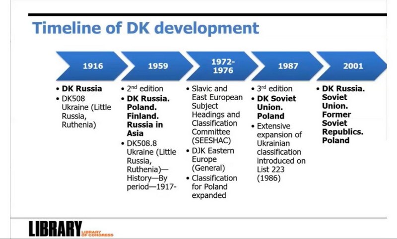 Вядома, спецыялісты разумелі розніцу, але на нейкім падсвядомым узроўні яно ўсё роўна спрацоўвала так, быццам бы «саюзных рэспублік» няма, ёсць толькі Расія. Гэта пачало змяняцца, калі Савецкі Саюз пачаў распадацца. З’явілася неабходнасць штосьці рабіць з незалежнымі дзяржавамі. Раздзел з класіфікацыйным кодам DK называўся «Расія, Савецкі Саюз, Былыя Савецкія Рэспублікі. Польшча». У гэтым раздзеле знаходзіліся ўкраінскія матэрыялы.