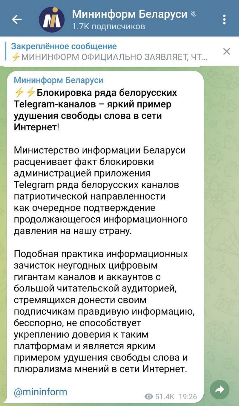 “Министерство информации расценивает факт блокировки администрацией приложения Telegram ряда белорусских каналов патриотической направленности как очередное подтверждение продолжающегося информационного давления на нашу страну”, – гаворыцца ў апублікаваным дакуменце.