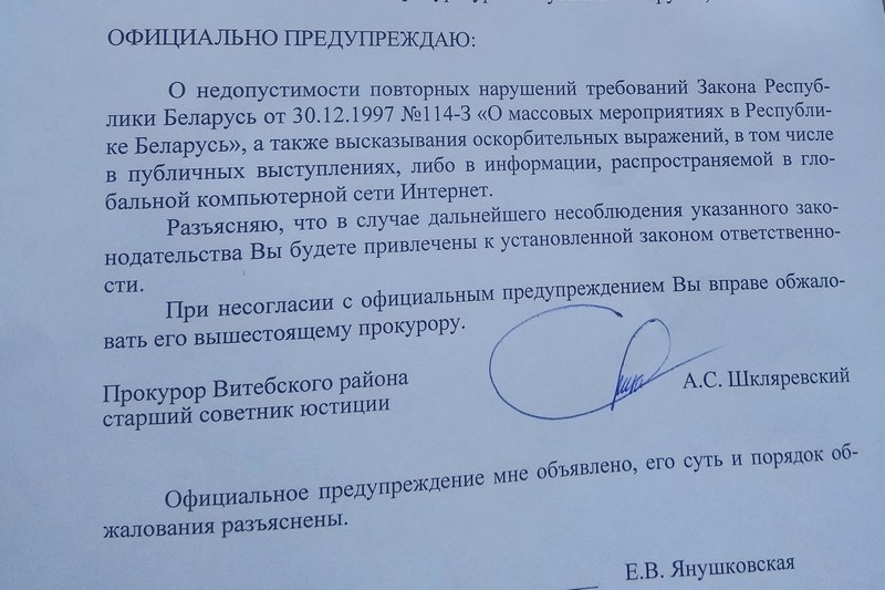 — Памочнік пракурора Аляксей Багдасаран сказаў, што ў пракуратуры ёсць прэтэнзіі да відаэроліка пра Полацкі райвыканкам пад назвай “Коронавирус-режим просит подаяния у белорусов”, нібыта ў ім я абразліва выказалася на адрас чыноўнікаў. Але лінгвістычную экспертызу не рабілі — прынамсі, ніякіх высноў пра абразлівыя выразы мне не паказалі. Яшчэ было сказана, што мяне папярэджваюць пра недапушчальнасць заклікаць людзей на несанкцыянаваныя мітынгі.