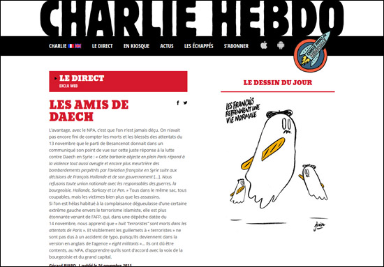 Скандально известный сатирический журнал не прошел мимо террористических актов, произошедших во французской столице в ночь на субботу и унесших жизни 129 человек.