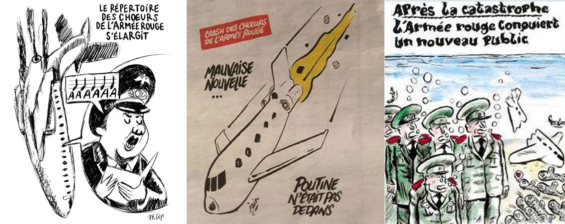 В колонке с карикатурами на разные темы Char­lie Heb­do размещает рисунок, посвященный катастрофе Ту-154 под Сочи, на борту которого находились, в том числе, музыканты Ансамбля песни и пляски Российской армии имени А. В. Александрова. На нем изображен в черно-белых тонах пассажирский самолет, падающий вертикально вниз. Картинка сопровождается комиксом с изображением поющего по нотам человека в российской военной форме. «Аааа», — такая реплика приписана персонажу. «Репертуар Хора Красной армии расширяется», — гласит комментарий к рисунку.