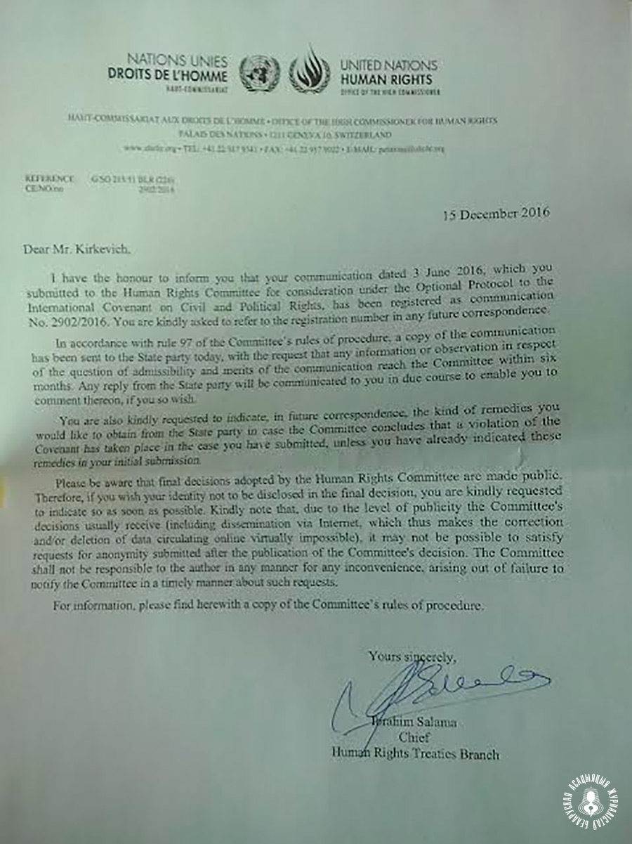 Cкаргу Кіркевіча зарэгістравалі ў камітэце ААН па правах чалавека