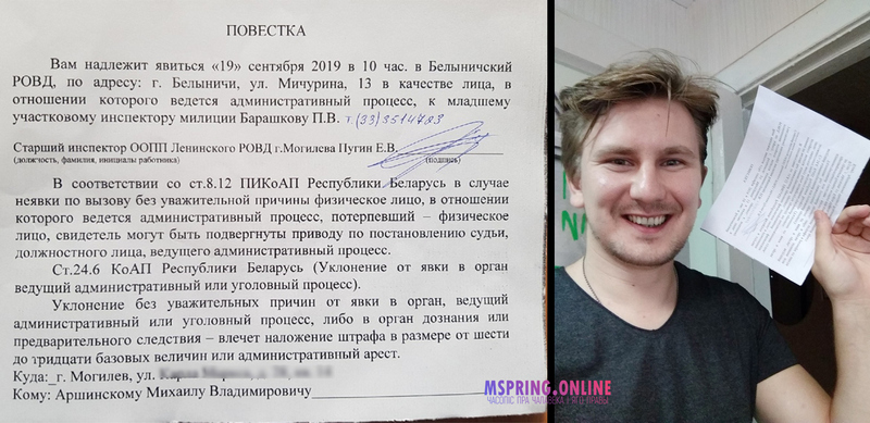 В самой повестке на имя Михаила Владимировича Аршинского указано, что тот должен был явиться в здание Белыничского РОВД 19 сентября как лицо, в отношении которого ведется административный процесс. Бураков вместо Аршинского решил не ехать: