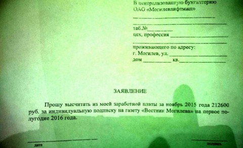 У якасці пацвярджэння сайт публікуe здымак бланка заявы супрацоўніка ААТ «Магілёўліфтмаш» у бухгалтэрыю прадпрыемства: заяўнік мае папрасіць вылічыць з яго лістападаўскага заробку 212 600 рублёў за падпіску на першае паўгоддзе 2016 г. на газету «Вестник Могилёва» (заснавальнік — Магілёўскі гарвыканкам).