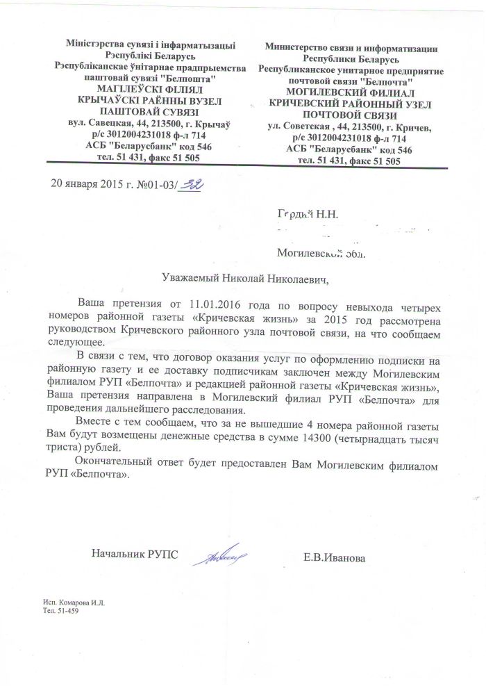 11 студзеня журналіст таксама накіраваў пісьмовую прэтэнзію на адрас Крычаўскага раённага вузла паштовай сувязі. Адказ на зварот прыйшоў вельмі хутка. Кіраўніца вузла паштовай сувязі напісала сп. Гердзію, што яго прэтэнзію накіравалі ў Магілёўскі філіял РУП “Белпошта” для далейшага разгляду, бо менавіта з ім, маўляў, заключала дамову на падпіску і распаўсюд рэдакцыя “Крычаўскага жыцця”.