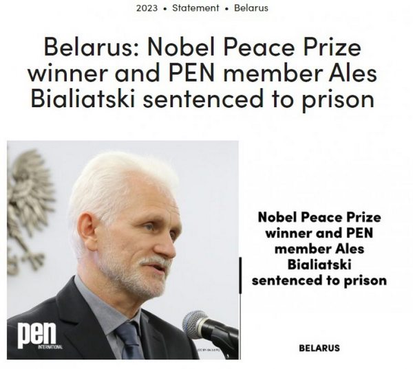 «Международный ПЕН-клуб возмущен приговором лауреату Нобелевской премии мира 2022 года Алеся Беляцкого в виде 10 лет лишения свободы. Беляцкий посвятил свою жизнь продвижению демократии и прав человека в Беларуси. В декабре ему запретили выступить с речью на церемонии вручения Нобелевской премии мира, где его приветствовали как маяк света для региона и за его пределами. Беляцкий является символом надежды, вдохновляющим правозащитников во всем мире, и его следует почитать. Мы призываем к его безотлагательному и безусловному освобождению, а также к отмене приговора и осуждения».