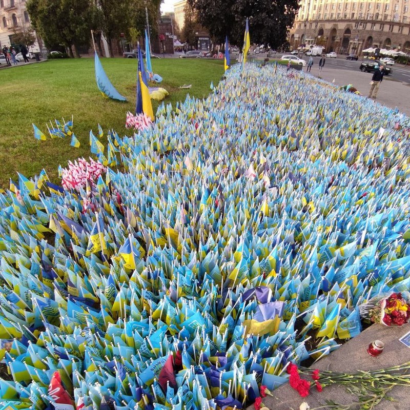 У цэнтры Кіева на Майдане Незалежнасці на пачатку вайны ўзнік стыхійны мемарыял. Тут лунаюць тысячы маленькіх сцяжкоў як памяць пра загінулых на вайне мужчын і жанчын. Ад вельмі сталых вайскоўцаў да хлопцаў 2000‑х гадоў нараджэння. Вусцішнае адчуванне.