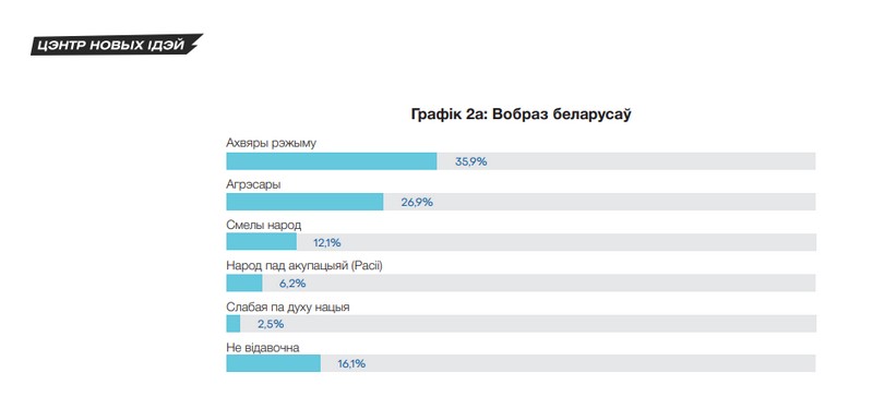 «З пачаткам вайны беларусаў усё часцей называлі суагрэсарамі адносна Украіны. Аднак вобраз смелай і мірнай нацыі, створаны ў 2020-ым годзе таксама не знік. Асэнсоўваючы сваю ролю ў дзеяннях рэжыму, лідары думкі сярод беларусаў пераконвалі ў вінаватасці альбо адсутнасці адказнасці ў вайне», — адзначылі аўтаркі даследавання.