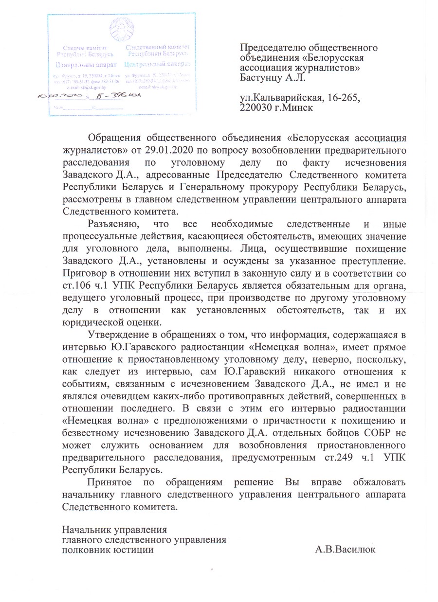 Следственный комитет Беларуси ответил на обращение ОО "Белорусская ассоциация журналистов", в котором организация призывала возобновить предварительное расследование по факту насильственного исчезновения Дмитрия Завадского в связи с признаниями бывшего сотрудника МВД Юрия Гаравского в интерьвю Deutsche Welle.