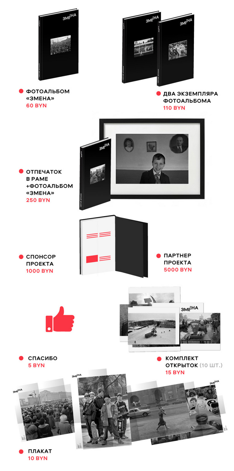 В фотоальбоме «Змена» мы восстановим дух Перестройки и первых лет независимости страны. Покажем первые шаги молодой Беларуси через объектив легенды белорусской фотожурналистики Сергея Брушко, который работал фотокорреспондентом газеты «Чырвоная Змена» и стал свидетелем невероятных изменений и перемен в общественной жизни и судьбе отдельных людей. Снимки фотографа показывают ключевые события истории: последствия взрыва на ЧАЭС, экономический кризис, забастовки рабочих, быт обычных людей и даже заключённых и солдат-срочников.