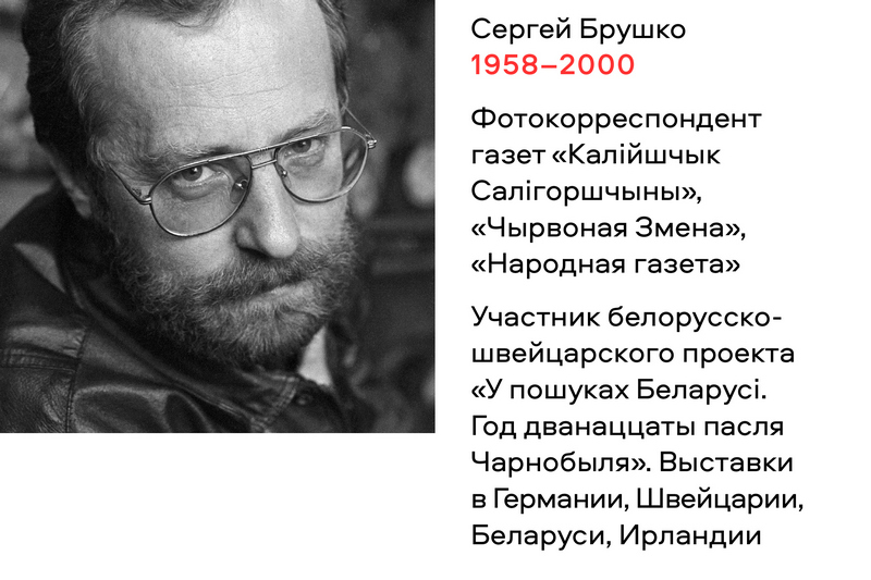 Сергей Брушко. Родился 28 мая 1958 года в городском поселке Городея, недалеко от г. Несвижа, Минской области. Работал фотокорреспондентом в газетах «Калійшчык Салігоршчыны», «Чырвоная Змена», «Народная газета». Участник белорусско-швейцарского выставочно-издательского проекта «У пошуках Беларусі. Год дванаццаты пасля Чарнобыля» (вместе со швейцарским фотографом Хуго Йегги (1998 г.). Выставки прошли в Германии, Швейцарии, Беларуси, Ирландии.