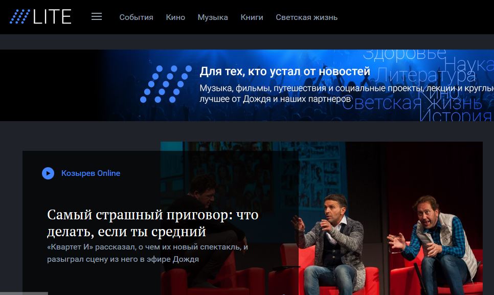«Друзья, рады представить вам Дождь LITE. Мы развили идею Дождя без политики в отдельный сайт, где нет места политическим дебатам, войне и сложным цифрам. LITE — это про лайфстайл, музыку, кино, искусство», — говорится в сообщении.