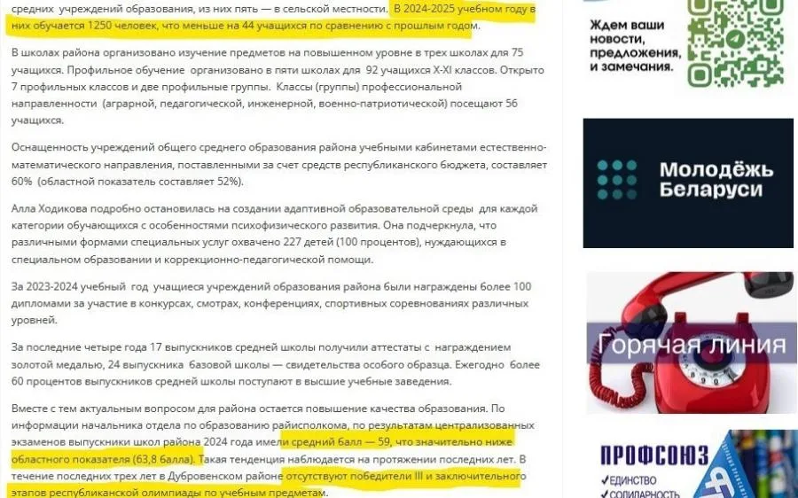 ”За апошнія тры гады ніхто са школьнікаў Дубровеншчыны не стаў пераможцам у рэспубліканскіх прадметных алімпіядах. І нават сярэдні бал на цэнтралізаваных іспытах у леташніх выпускнікоў — усяго толькі 59, што значна ніжэй за сярэдні бал па вобласці (63,8). Толькі каля 60% выпускнікоў Дубровенскіх школ паступаюць у вышэйшыя навучальныя ўстановы. Вывучэнне прадметаў на падвышаным узроўні арганізавана толькі ў трох школах раёна для 75 вучняў, профільнае навучанне — для 92 школьнікаў, класы прафесійнай накіраванасці наведваюць 56 школьнікаў (усяго іх 1250)”, — пісала па матэрыялах артыкула ў дубровенскай газеце “Віцебская вясна”.