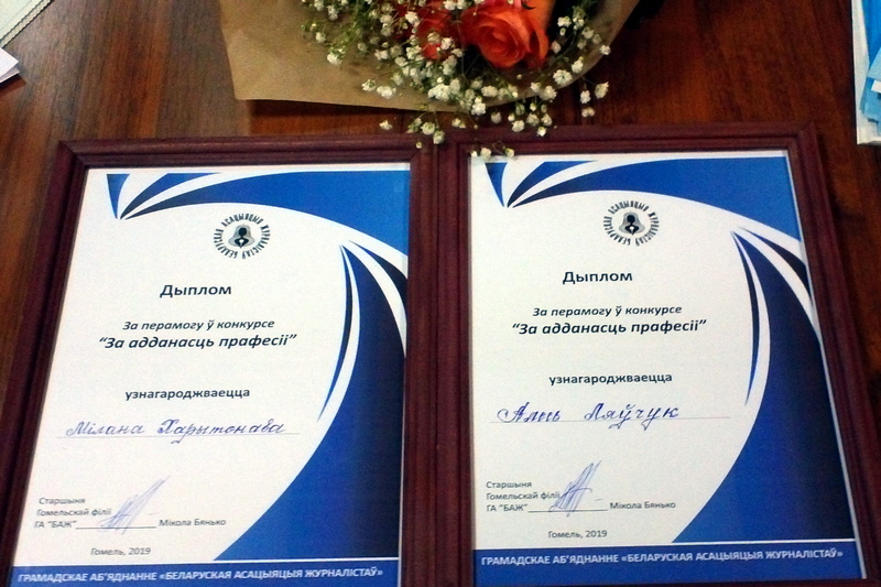 Дыпломам “За адданасць прафесіі” ўганаравалі незалежных журналістаў Алеся Ляўчука і Мілану Харытонаву