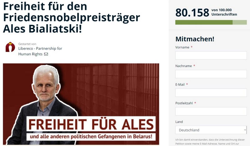 Нямецка-швейцарская праваабарончая арганізацыя Libereco — Partnership for Human Rights за тры тыдні сабрала ўжо больш за 80 000 подпісаў пад петыцыяй з патрабаваннем вызваліць Алеся Бяляцкага і ўсіх іншых беларускіх палітычных зняволеных.