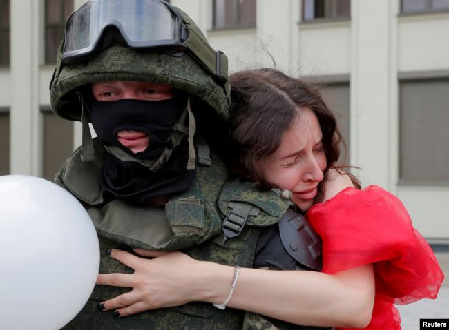 І яшчэ фота Васіля Фядосенкі. Удзельніца пратэсту абдымае супрацоўніка ўнутраных войскаў МУС Беларусі, які стаіць на варце падчас дэманстрацыі апазыцыі ля Дома ўраду на плошчы Незалежнасьці ў Менску 14 жніўня.