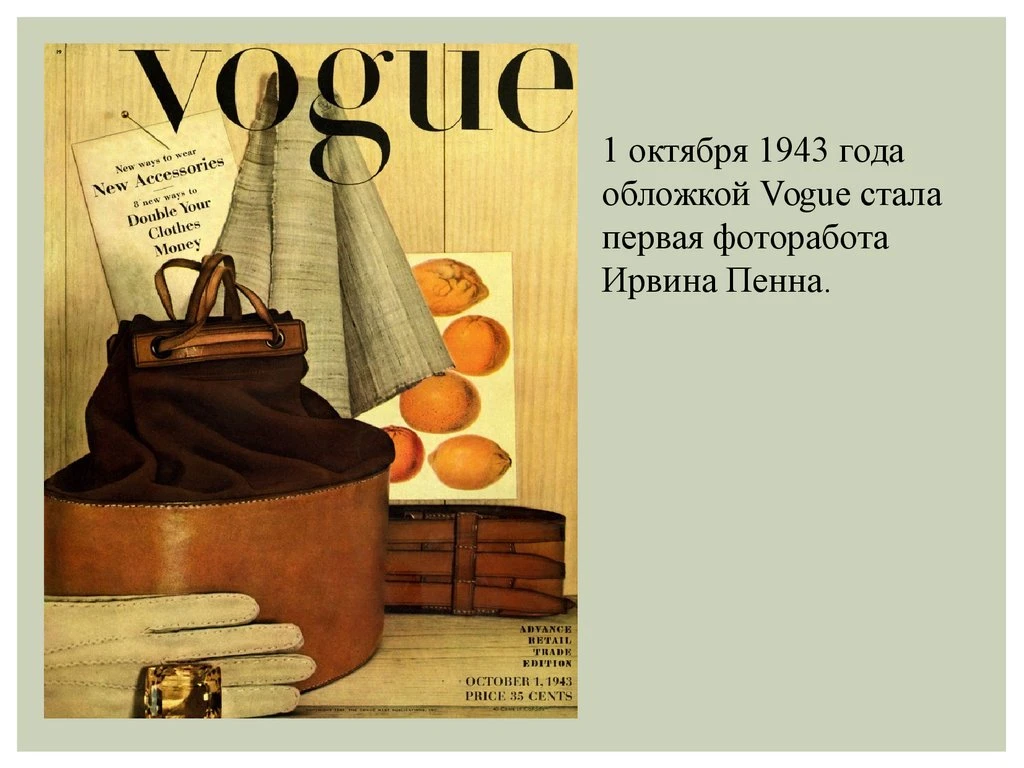 Но вначале (после учебы, путешествий и поиска себя) волею случая Пенн оказался ассистентом арт-редактора Vogue Александра Либермана. Ирвин на все имел свое видение, в том числе на то, как должна выглядеть обложка настоящего глянца. Фотографы лишь бурчали, а начальник дал совет в духе: «Если ты такой умный и все знаешь — покажи как надо!»