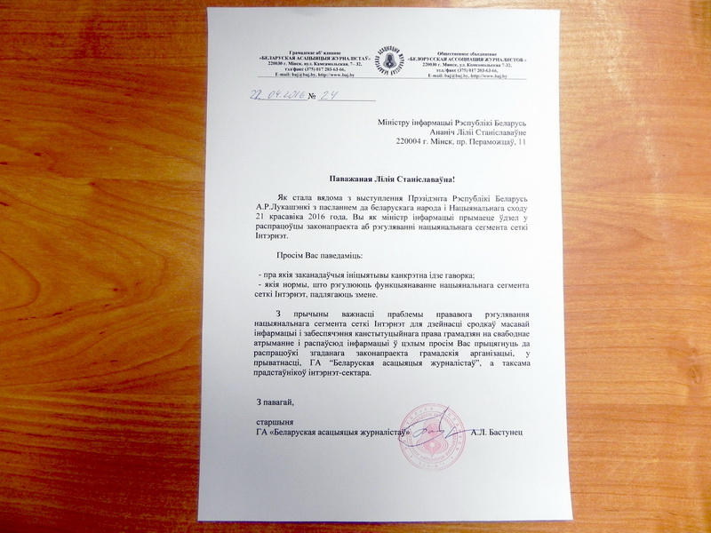 “З прычыны важнасці праблемы прававога рэгулявання нацыянальнага сегмента сеткі Інтэрнэт для дзейнасці сродкаў масавай інфармацыі і забеспячэння канстытуцыйнага права грамадзян на свабоднае атрыманне і распаўсюд інфармацыі ў цэлым просім Вас прыцягнуць да распрацоўкі згаданага законапраекта грамадскія арганізацыі, у прыватнасці, ГА “Беларуская асацыяцыя журналістаў”, а таксама прадстаўнікоў інтэрнэт-сектара”, – піша міністру інфармацыі старшыня ГА “БАЖ”.