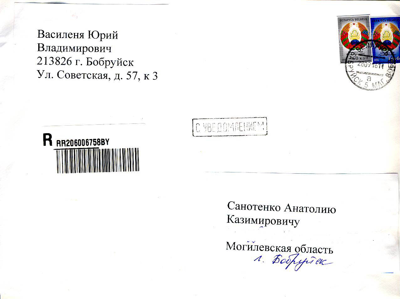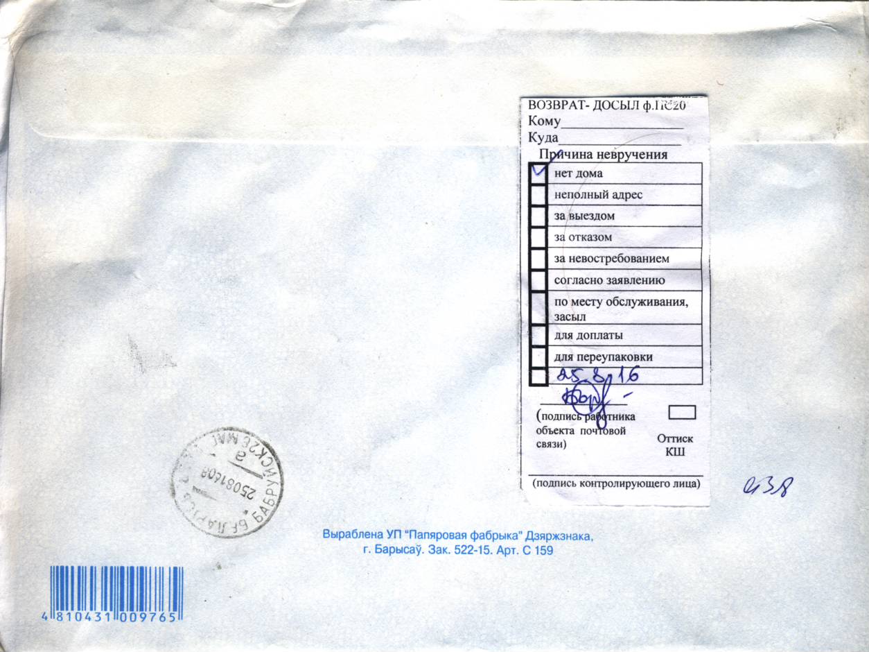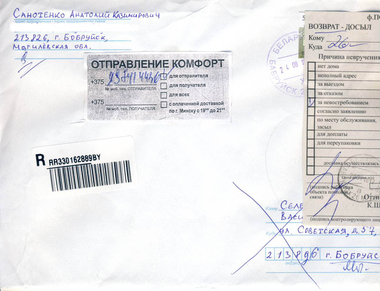 Прайшоў месяц — і пошта вярнула ліст як незапатрабаваны. Гэта значыць, ніхто не прыйшоў за ім на пошту — нягледзячы на шматразовыя паведамленні. Гісторыя на гэтым не скончылася, бо праз два дні Анатоль Санаценка атрымаў на свой хатні адрас яшчэ адно пасланне (таксама з паведамленнем) — з практычна аналагічным тэкстам.