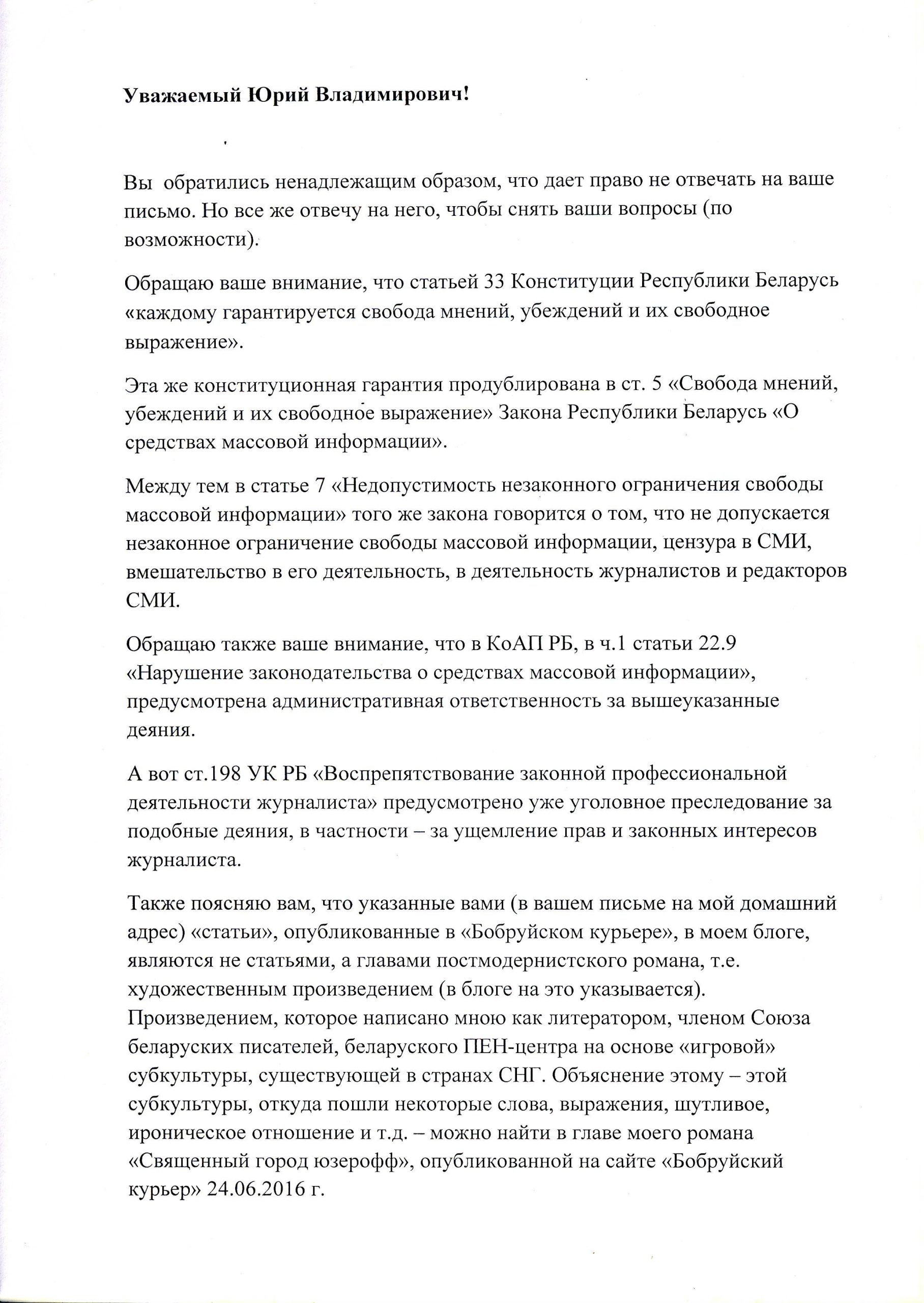 Ліст прыйшоў на хатні адрас журналіста, ён не быў аформлены ў адпаведнасці з заканадаўствам аб зваротах грамадзян, але кіраўнік незалежнага выдання ўсё ж вырашыў адказаць на яго. Свой адказ ён адправіў заказным лістом.
