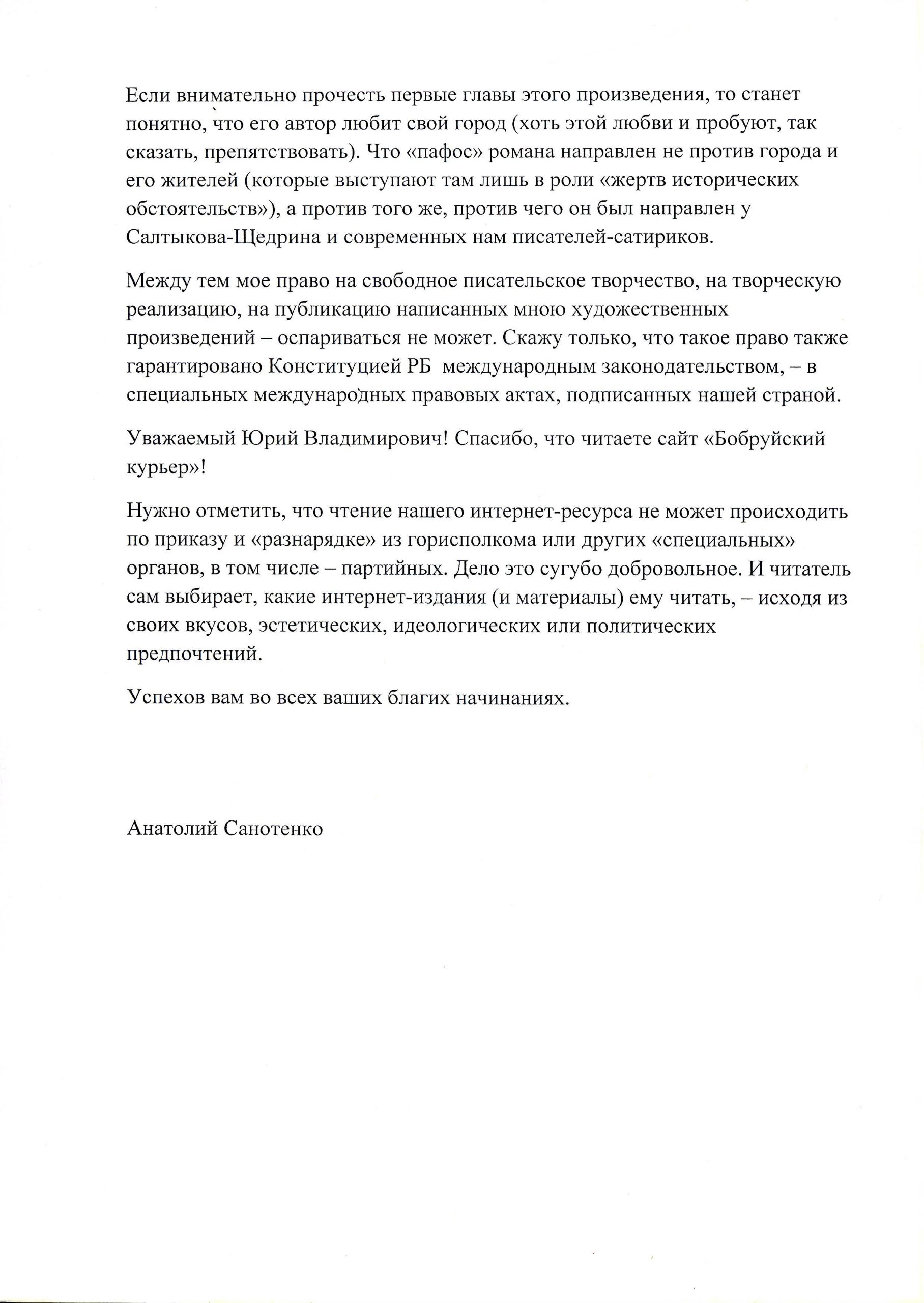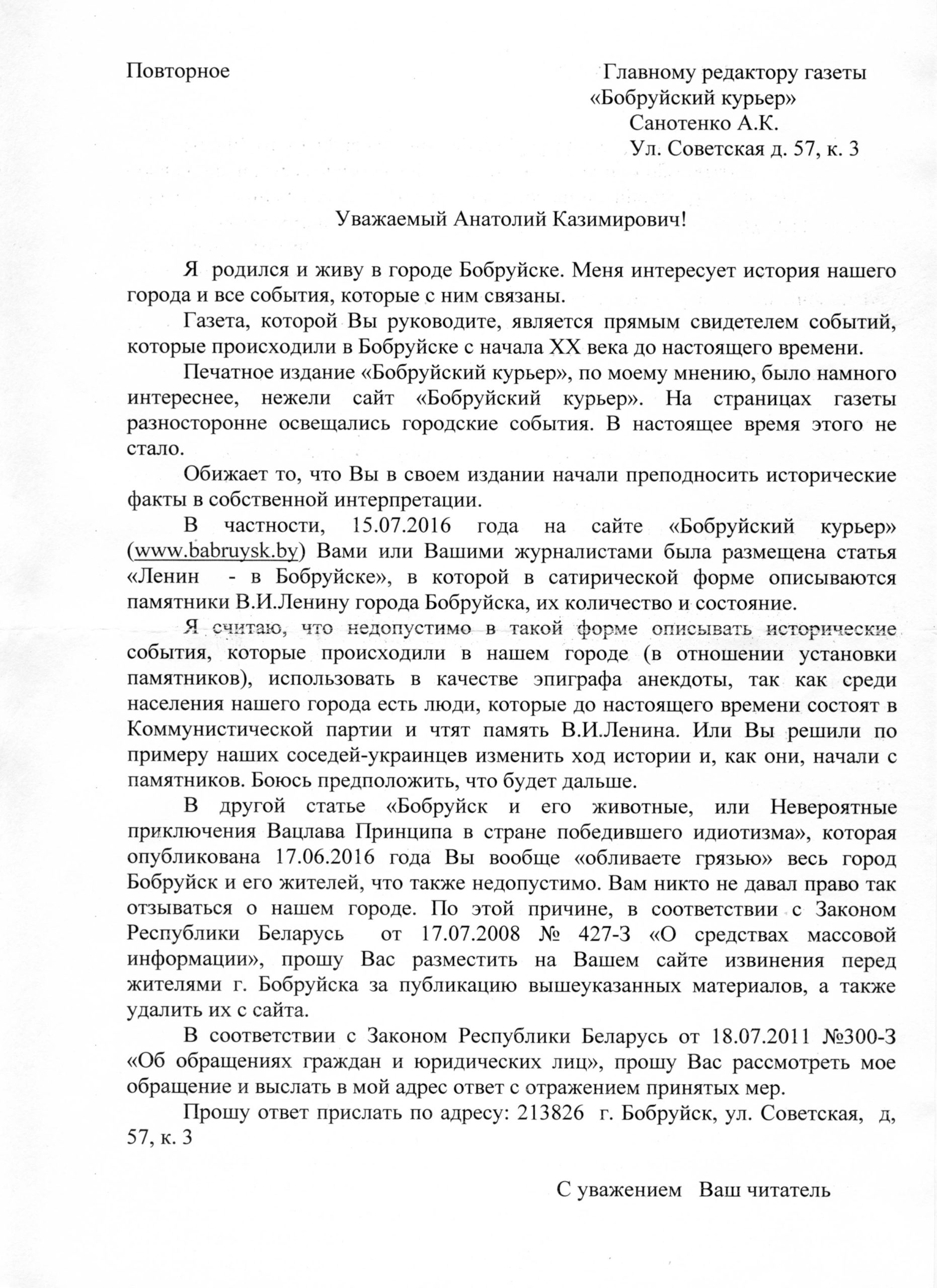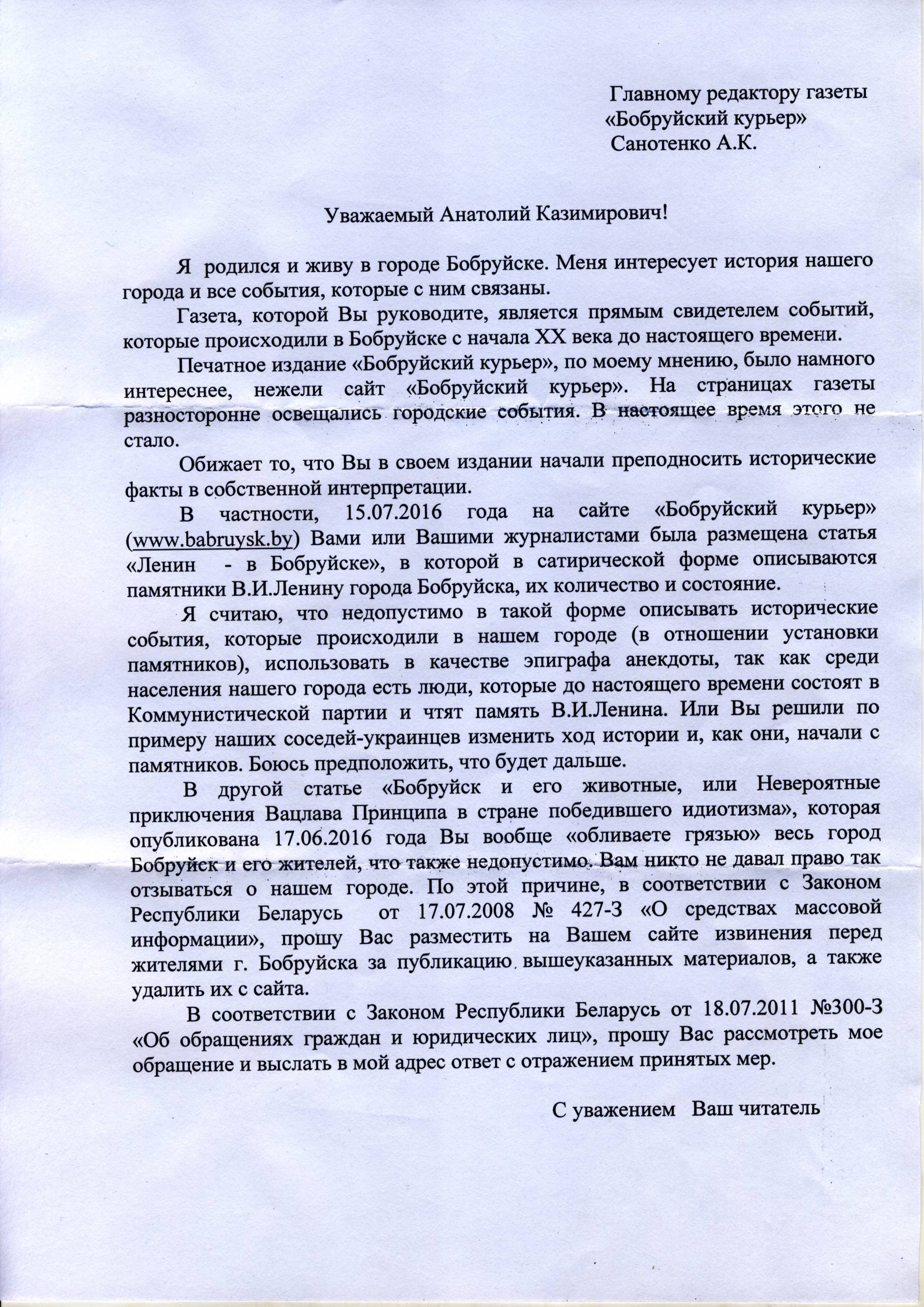 У сярэдзіне жніўня кіраўнік «Бобруйского курьера» атрымаў на свой хатні адрас ліст ад чытача яго выдання, падпісаны толькі на канверце — у выглядзе прынтараўскай раздрукоўкі адраса, прозвішча й імя адрасата. У лісце — «крыўда» на тое, што на сайце «Бобруский курьер» Анатоль Санаценка размясціў «артыкул» «Ленін — у Бабруйску», «у якім у сатырычнай форме апісваюцца помнікі У. І. Леніну горада Бабруйска, іх колькасць і стан».