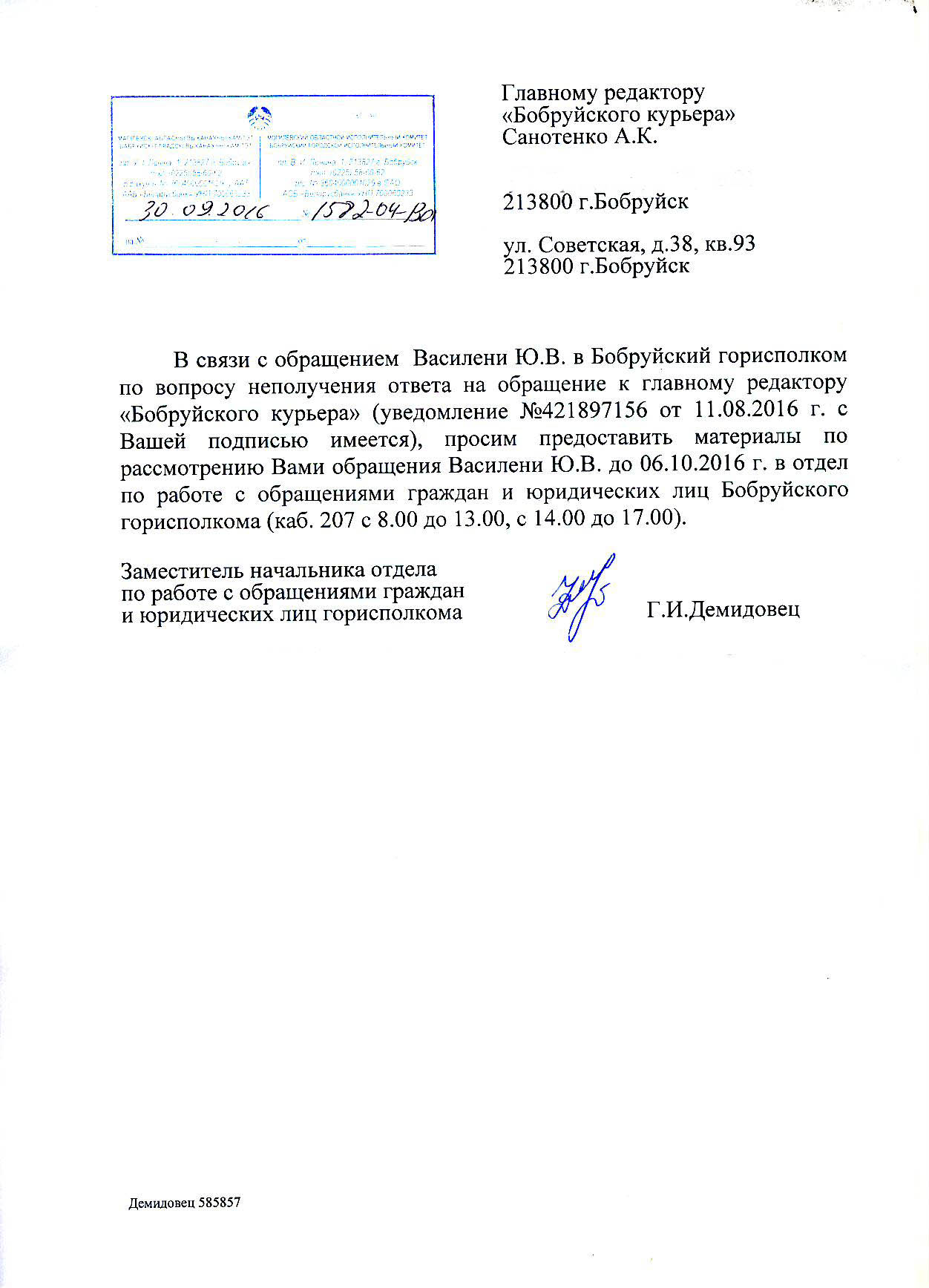 А паміж тым 4‑га кастрычніка галоўны рэдактар «БК» атрымаў на хатні адрас ліст з аддзела па працы са зваротамі грамадзян і юрыдычных асобаў Бабруйскага гарвыканкама — з просьбай да 06.10.2016 «даць матэрыялы па разглядзе Вамі звароту Васілені Ю.У.».