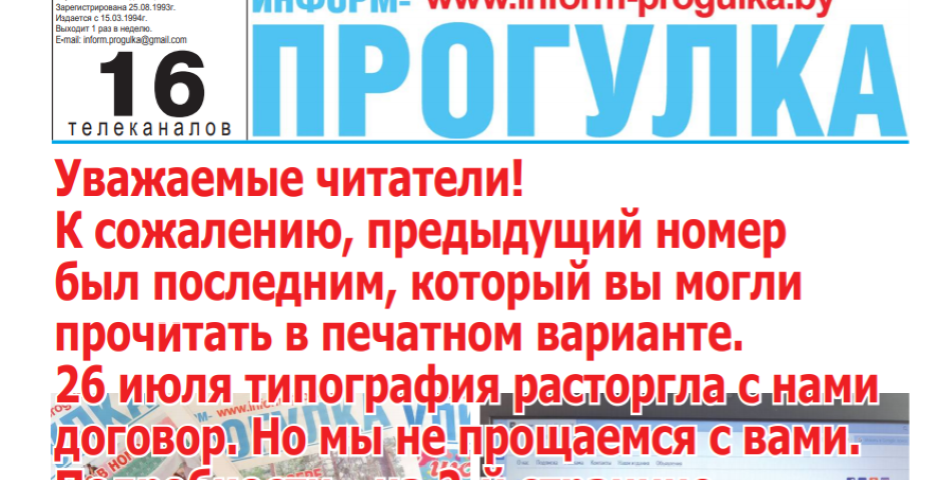 Газета «Информ-прогулка» спыніла выхад у друкаваным выглядзе. Прычына: тыпаграфія скасавала дамову з рэдакцыяй. Выданне можна чытаць на вэб-сайце inform-progulka.by.