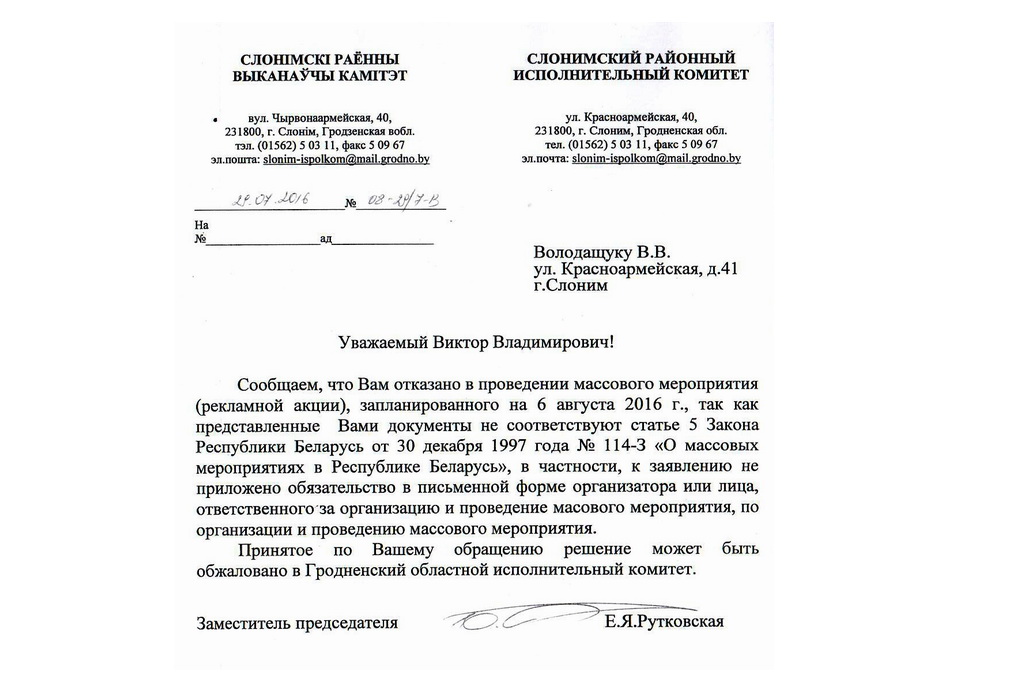Галоўны рэдактар і выдавец “Газеты Слонімскай” Віктар Валадашчук звярнуўся ў Слонімскі райвыканкам з просьбай дазволіць правесці ў суботу, 6 жніўня, святочнае мерапрыемства (рэкламную акцыю) з нагоды выхаду 1000-га нумара газеты ў скверыку ў цэнтры Слоніма. Там звычайна і праводзяцца падобныя мерапрыемствы. Аднак “Газету Слонімскую” святкаваць свой юбілей у цэнтр горада ўлады не пусцілі.