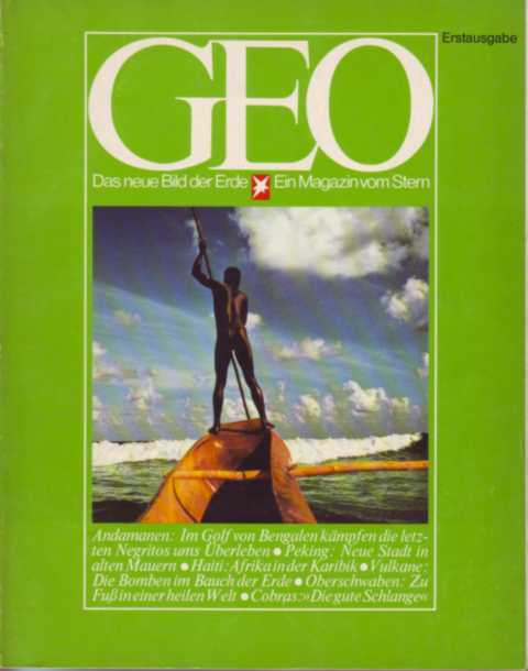 В первом номере журнала GEO рассказывалось о Андаманах, Пекине, Гаити, вулканах как явлении, кобрах и Верхней Швабии в Германии. На обложку была вынесена фотография знаменитого индийского фотографа и первопроходца цветной фотографии Рагхубира Сингха. Она изображала чернокожего жителя Андаманских островов за рыбалкой.