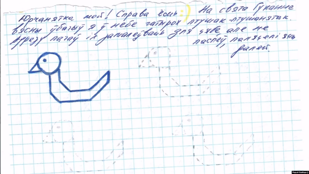 «Я тут падумаў, а чаму б нам з табой ня весьці сваю перапіску. Мама ня супраць, трэба толькі твая згода. Будзем абмяркоўваць розныя цікавосткі з твайго і майго жыцьця. Я буду пісаць табе ўсё вартае ўвагі, што вычытваю ў турме ў кнігах, газэтах, часопісах, даведваюся з размоваў. А ты мне пішы пра свае справы: школа, клопаты штодзённыя, пра Юрасіка абавязкова 😊, што чытаеш цікавага і глядзіш. Ну і абавязкова марскі бой!!! Пачынаем з гэтага моманту. Малюй поле 10 на 10 клетачак і расстаўляй там 12 адпалубных караблікаў.»