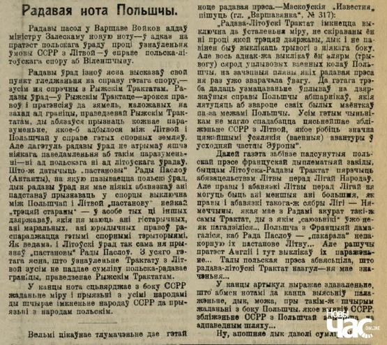 “Многа пекных слоў нагаварыла нам у сваіх нашумеўшых “дэклярацыях” тая польская нацыяналістычныя “лявіца”, якая і фізычна і маральна падтрымала пераварот маршала Пілсудзкага, запэўняючы нашы працоўныя масы, што ад гэнага перавароту настане і для нас “рай” у Польшчы. Але не дарма беларускія сяляне і работнікі аднясьліся да гэных пекных слоў дужа недаверчыва: з першых жа крокаў новага ўраду ясна відаць, чаго ад яго можа спадзявацца працоўная Беларусь.