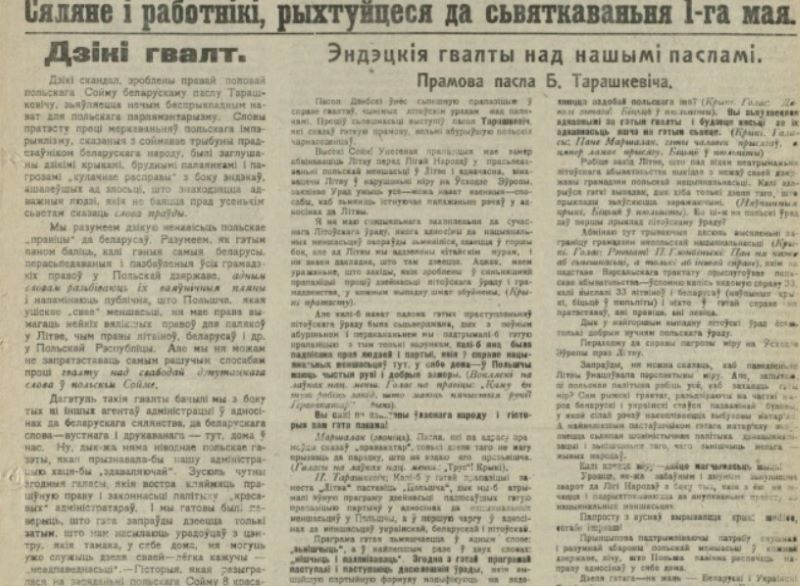 І пад той час, як “крэсовыя” палякі-абшарнікі ўсяляк стараюцца ўхіліцца ад цяжару, што на іх узложаны ў постаці “падатку на маёмасьці”, — нашае сялянства пакорна плоціць тое, што ад яго вымагаюць. Вось жа ў гэты мамэнт, калі Польскай Рэспубліцы прыпатрэбіліся і грошы беларускага працоўнага народу, больш чым калі павінны мы падняць свой голас.
