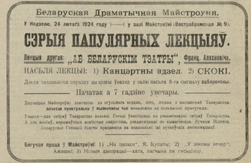 Першая лекцыя: «Аб Беларускай драме» Антона Луцкевіча. Пасьля лекцыі: Канцэртны аддзел і скокі.