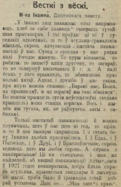 Цяпер другі прыклад. У кастрычніку паліцыянты праз увесь месяц рабілі ў нашай вёсцы вобыскі, у часе якіх канфіскавалі гэткія рэчы: у гр. Піліпа Швака 5 пар падковаў, у гр. Рака – сьценны гадзіньнік, у Антося Касмовіча – дзьве пары бялізны і ручнік, які паліцыянты прызналі за панскі. Але ж гэты ручнік быў уласнага вырабу, бо нашыя кабеты ўмеюць вельмі добра і прыгожа ткаць.